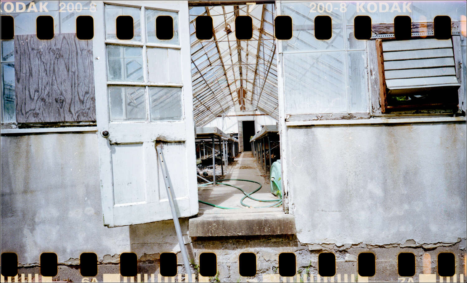 Something new this time, sprocket photos with color film. These were shot on my Lomo LCA120, which is great for sprockets because it has wind-on advance vs back-window frame numbers. These are a mixed bag of photos, but I think that the first one, the greenhouse door, is my favorite. I should back up a little on these photos to move the subject inside the sprockets. The film also, Gold 200, should have been rated at 125 or 160 to overexpose a little. The negatives were a little thing and hightlights bloomed more that I would have liked, especially on