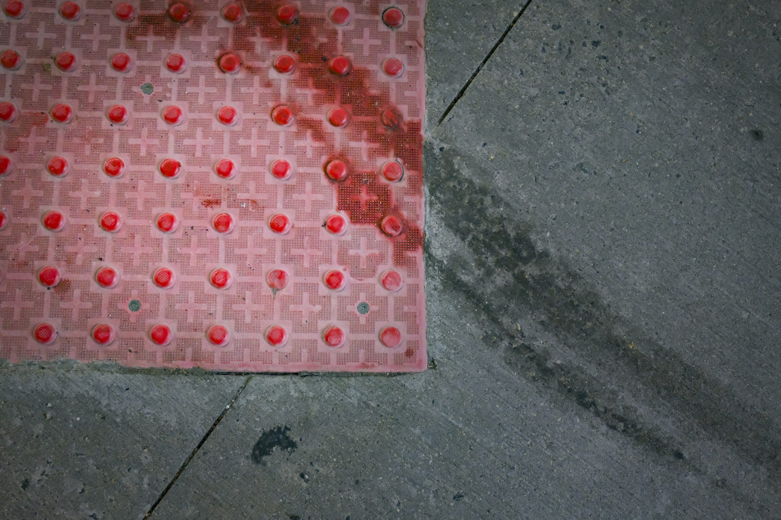 The last one s the ever-present-in-NJ red safety anti-slip pad at a corner in Hoboken. Someone had dragged something along the pad and my thought was “what was on that?”.