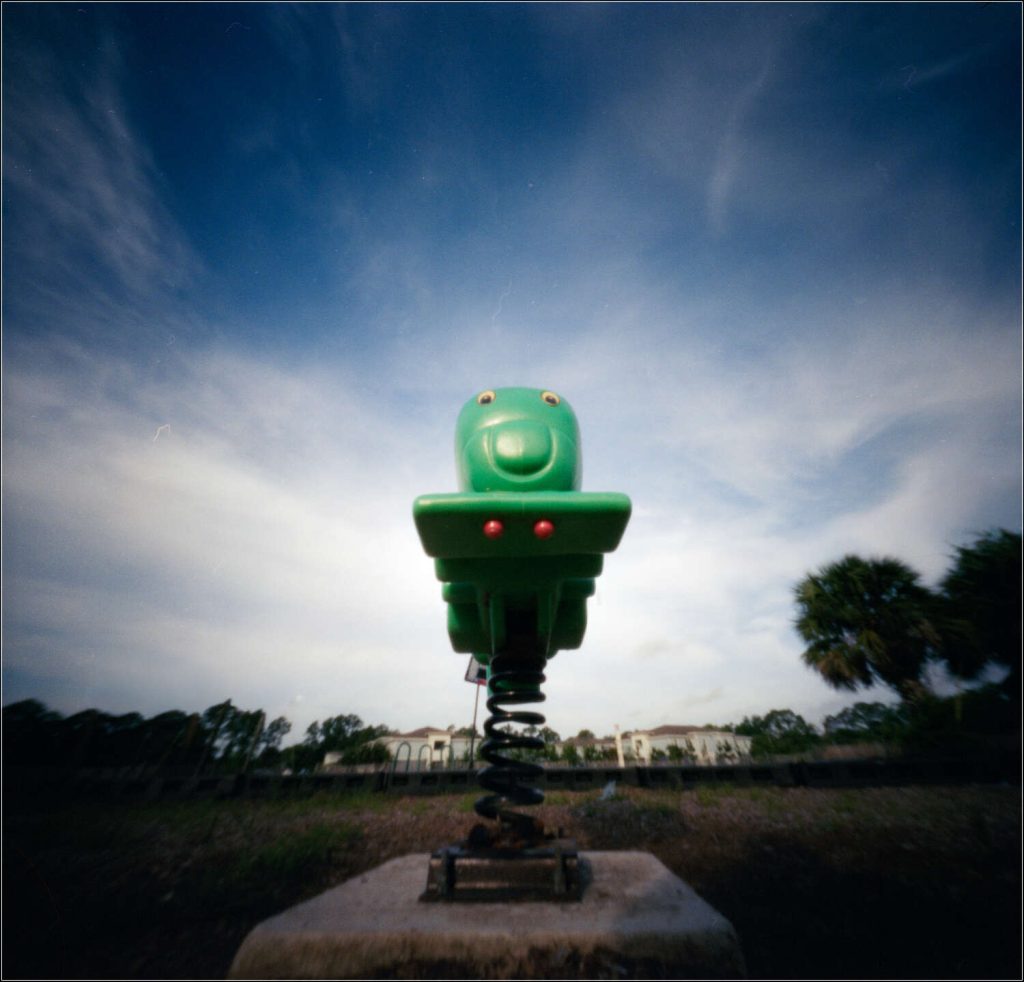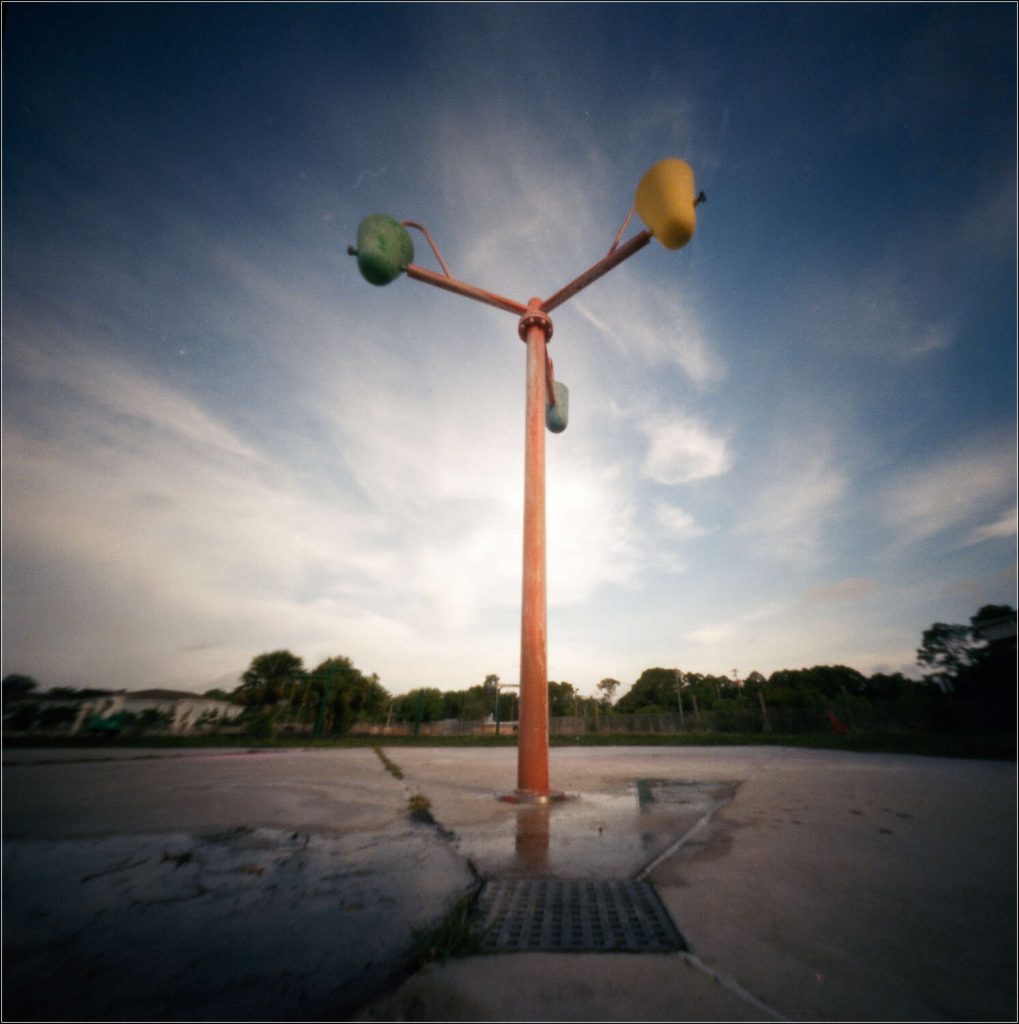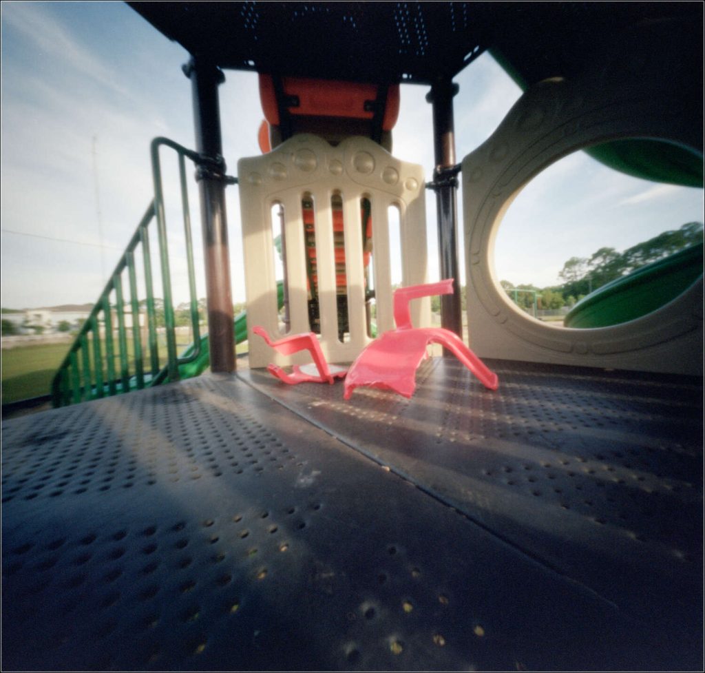In the sleepy little town of Apalachicola, Florida, there is a tiny water park and playground that was obviously the brainchild of someone in the past. It’s behind a school and next to a now-closed day school. I found this location by just driving around early one morning. The lot is overgrown. The poor water umbrella and the shower heads are all starting to rust in the moist, warm Florida salt air and weather. As I walked around, I had several cameras with me, my Olympus EM1 Mk2, Olympus EM5 Mk1 Infrared, and a Reality So Subtle 6×6 film pinhole. I saw these subjects and had a roll of Kodak Gold 200 color C41 film which I thought would be perfect. While I also got some lovely Infrared shots, this possibility of color pinhole struck me as possible.